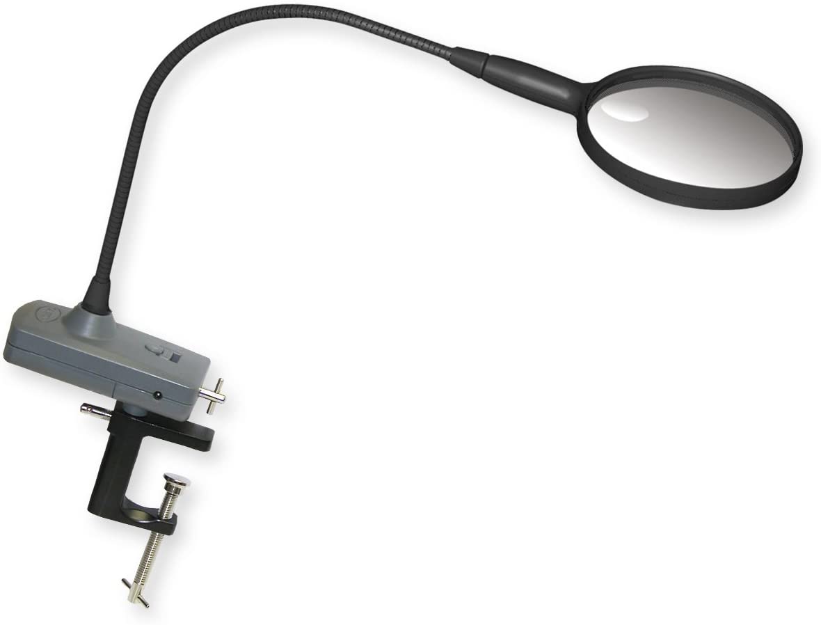 The Carson MagniFly features a 2x magnification and the LED comes with 3 very bright LED bulbs. It can either be run on power with an 4.5v AC/DC adapter or on batteries (which you will have to get separately). Comes with a limited lifetime guarantee.